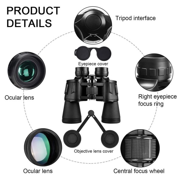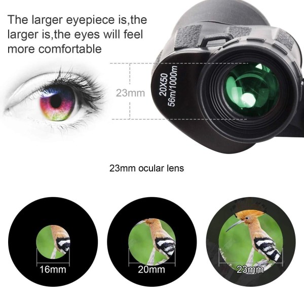 Wide Field of View- 20x magnification, 23mm eye lens diameter and 50mm objective diameter; 56m field of view at 1000m; When you use this binoculars, the vision is broad and it is very clear for the gain of binoculars. Professional Powerful Binoculars- Multilayer-coated aspherical lenses elements provide superior light transmission and minimal distortion, better image brightness, contrast and quality. The Bak-4 prism has a perfectly round exit pupil. Providing bright, clear and razor-sharp viewing. Sleek and Solid- Waterproof body with rubber coated finish for shock-resistance and a firm, comfortable grip, durable and portable for outdoors, even suitable for hostile environment. Easy to Adjust- The centre-focus knob of this compact binoculars guarantee fast and high precision focusing. And it can also focus on the different distance with right eyepiece ring. Being used with tripod is OK. So it is very convenient when you watch something for a long time. Versatile to Use- This binoculars are designed for birding watching, hiking, hunting, climbing, trip, football basketball or any Sports competition, concert. And it is also a best Christmas gift for adults, kids, children