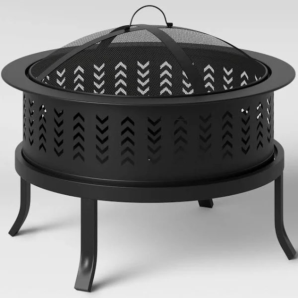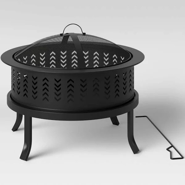 Add a cozy place to gather in your outdoor space with the 26-Inch Chevron Outdoor Fire Pit from Threshold . This freestanding outdoor fire pit features a simple and classic design with a heat-resistant steel construction and sleek black finish, but gets a little additional detail from chevron cutouts all around the perimeter. The removable lid features a spark screen to help reduce flying embers when burning wood inside, and it also makes for a neat and tidy look when you’re not using the fire pit. Plus, this 26-inch round fire bowl also comes with a poker to help you manage your fires.