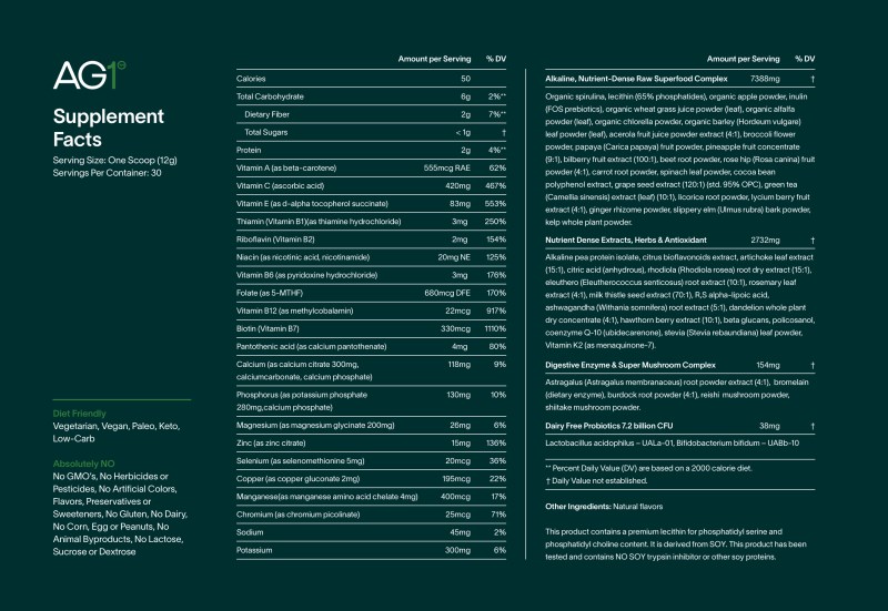 AG1 is a comprehensive + convenient daily health drink with 75 vitamins, minerals and whole food-sourced nutrients, made for just about everyone. Beyond just a greens powder, AG1 is a multivitamin, probiotic and prebiotic green supplement that supports overall health and immune support, as well as boosts energy, promotes strength and stamina and aids in digestion & gut health. One Scoop, 8 ounces of water. AG1 greens powder delivers daily nutrition in one refreshing, great tasting green drink and is NSF Certified for Sport . Optimized nutrition, offering a researched balance of vitamins & minerals.