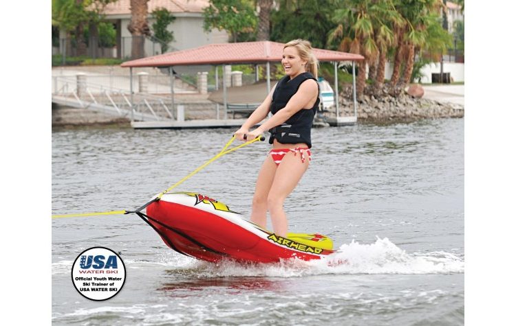 The Airhead Big EZ Ski Trainer is the perfect option for water skis with a revolutionary inflatable water ski hybrid design. These water skis feature integrated wooden water ski trainers and ski bindings. As an official USA Youth Ski Trainer, you can trust the Airhead Big EZ Ski Trainer to make water skiing fun from the start! Features: Inflatable water ski hybrid Official USA Youth Ski Trainer Designed for stability while towing Easily board from the swim step or stern of the boat Integrated wooden water ski trainers and ski bindings Teachers proper stance, handle position, balance, and weight transfer for turning Specs: Cover: Full Nylon Length X Width Inflated: 54in. x 34in. x 13in. Max Capacity: 120lbs. Number Of Riders: 1 Rider.