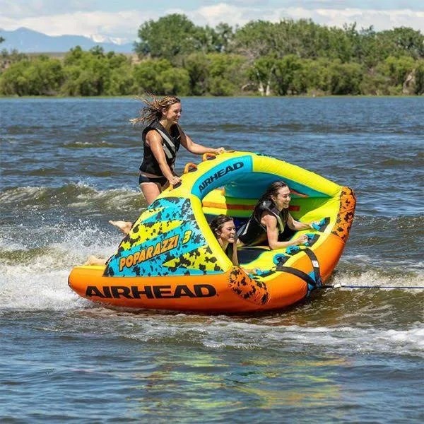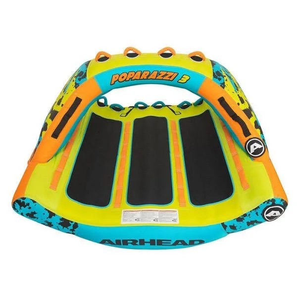 Catch a wave with the new Airhead POPARAZZI for up to 3 riders! Its unique, high winged shape with rocker bottom allows you to carve into the wake and glide across the water’s surface with minimal drag. With a turn of the boat, inside riders will teeter deep into the wake while the other riders will rise high above it. Multiple EVA foam body pads allow riders to comfortably perform every riding position imaginable. The unique High Rise Tower equipped with multiple double webbing foam handles with knuckle guards allow standing or kneeling on the back deck. Stand, sit, kneel, steer, lay, balance and freestyle with the new POPARAZZI! Show more Show less High Rise Tower on rear deck Unique rocker bottom construction Heavy-duty full nylon cover with zipper Kwik-Connect tow point Patented speed safety valve Specs Unit Weight 59.00 lb