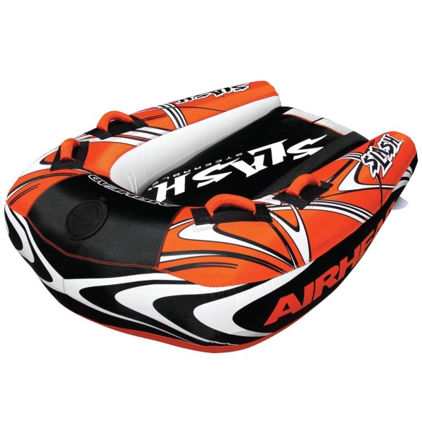 The chariot-style Slash & Rip Boating Tubes by Airheads for either 1 or 2 riders, have all the standard features you’d expect from an industry-leading brand such as Airhead, but with one big addition: they can be steered! Whether you want to pull your young ones around, give yourself an edge in your next tube war, or see how much air you can catch launching off the wake, these towables have proved to be a good investment for countless boaters. Two people can carve turns with SLASH II! Both riders simply lean in the direction they want to turn and pull on the opposite handle. The plastic fins sewn onto the side of the cover do the carving. SLASH II is so much fun that you’ll want to ride it all day long! You just might be able to, since it’s so easy to re-board with the open back design, a feature that little ones and tired adults really appreciate. SLASH II has a 30-gauge PVC bladder and is fully covered with double-stitched 840-denier nylon, making it torsionally rigid to respond to rider’s commands. It’s equipped with a Kwik-Connect, Airhead Boston valve and 4 deluxe nylon-wrapped handles with neoprene knuckle guards. Designed for 1 or 2 riders. 58in x 48in (deflated).