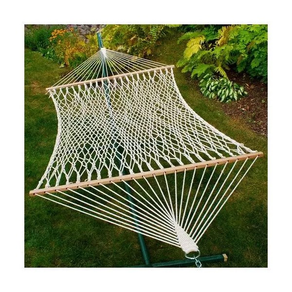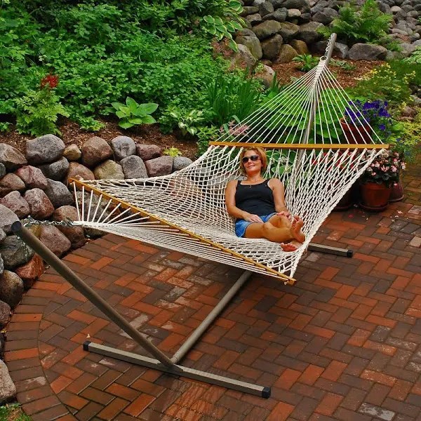 Join a friend for a nap in this two-person hammock. Not only is it attractive and comfortable it’s strong and durable. Use either indoor or outdoor. Either place you’ll enjoy the look, feel, and comfort of this 100percent natural cotton hammock. Hammock bed measures 60″wide x 82″long. Hanging hardware not included. Fits 15 foot two-point hammock stand (not included). Weight Capacity 350 lbs