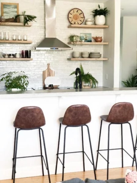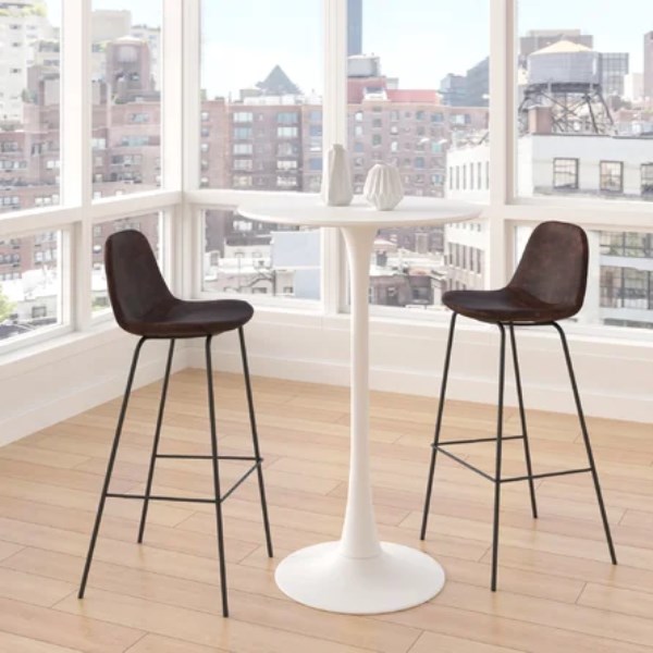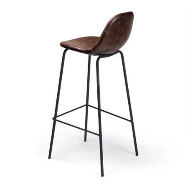 A laid-back blend of mid-century and industrial styles, this dining stool wraps an armless bucket seat in low-maintenance faux leather embellished with decorative stitching. Its open metal base features a footrest for stability and plastic glides to protect your floors. Set of two.
