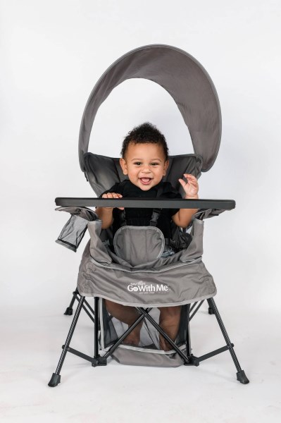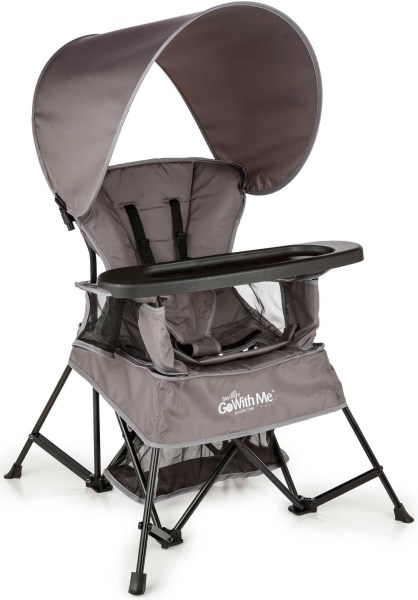 Travel with ease with this transitioning-design chair that takes you from infancy to big-kid ages. The 5-point removable harness makes your upright-sitting baby secure and comfortable in the seat, and as Baby grows, a flap on the seat detaches to reveal two leg holes perfect for letting your little one stand with support. With a snack tray and sun canopy, it’s the perfect on-the-go solution for your growing baby. Dimensions: 24.5″ tall x 23″ wide x 22.75″ deep.