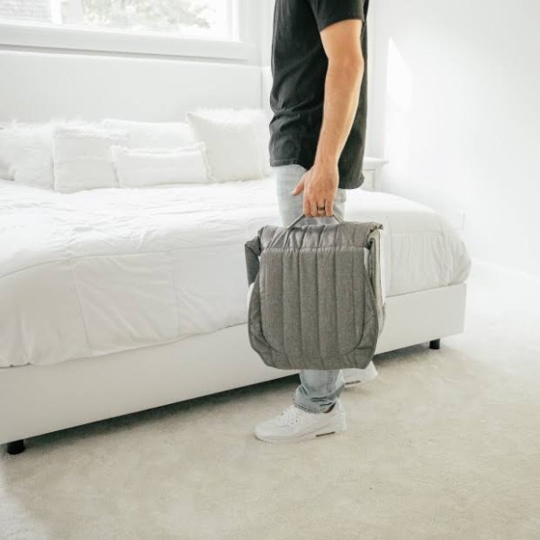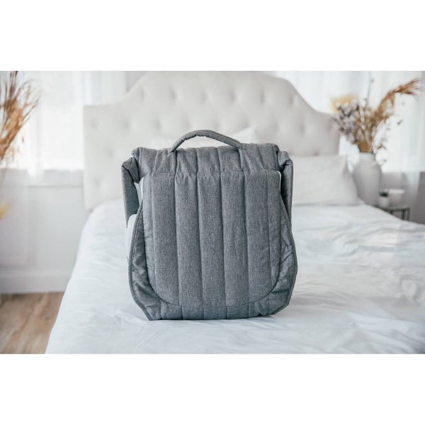 The Snuggle Nest Harmony Portable Infant Sleeper creates a comfortable and safer sleep environment for a baby within an adult bed. The updated design features two rigid, vented walls that are 8 tall. The bed length has been extended to accommodate longer babies while the width of the Snuggle Nest can fit comfortably in both Queen and King size beds. The tall walls are lined with a soft, breathable mesh helping to provide ample air circulation. An adjustable sound & light unit offers a gentle night light and soothing sounds of the womb or Brahms Lullaby. The Snuggle Nest quickly and easily folds in half and is ideal for using at home, as well as for travel. The inside can even be used to store essentials like diapers, wipes and a change of clothes.