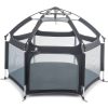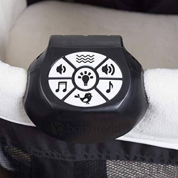The Baby Trend Retreat Nursery Center has just about everything you need to keep your baby happy, clean, and safe. This portable playard includes two removable full bassinets, changing table, and a deluxe organizer for diapers, wipes, toys, and outfits. The removable Rock-a-Bye Bassinet features a canopy and handle; this deluxe bassinet can even turn into a standalone rocker to help your little one relax and sleep. The plush, fabric-lined playard has mesh sides for proper ventilation. Move the foldable playard from place to place with its large wheels, and lock the brakes in place with 1 hand. A carrying bag is included for easy transport or storage. Fun and practical, the Baby Trend Nursery Center features an electronic music center to keep babies entertained. This music center has buttons for volume control, a nightlight, and vibration. There are 2 styles of music as well as nature sounds, giving your little one plenty of options. Designed for little ones aged 0 to 24 months, the Baby Trend Nursery Center has everything you need to care for and entertain your baby or toddler.