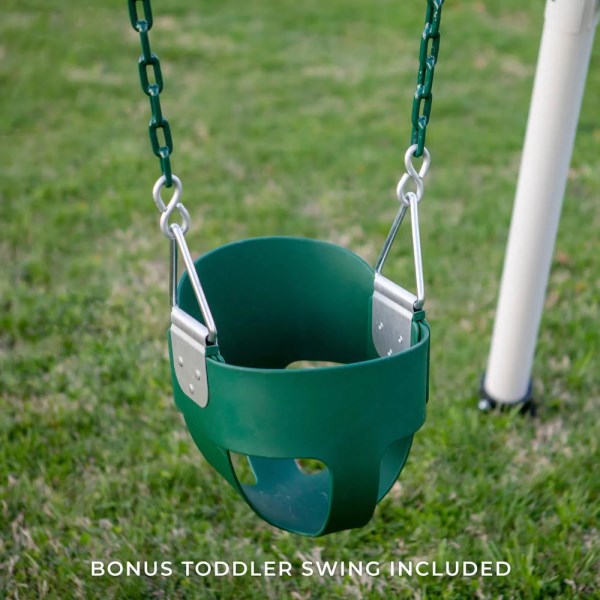- Wide-lane swing positions come equipped with 2 heavy-duty belt swings and includes a third toddle bucket swing.