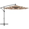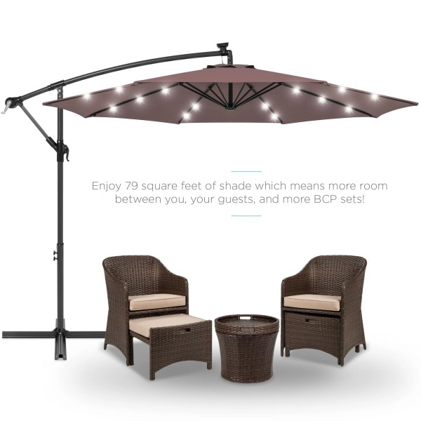 Enjoy 79 square feet of shade which means more room between you, your guests, and more BCP sets! Use it in the day for any occasion; turn your outdoor dining area into a shaded lounge for family and friends. Solar powered LED lights also allow for night use; reignite your passion for outdoor dining and brighten your summer nights. Find the perfect angle, as the handle on the pole moves up and down to adjust your umbrellas angle. Securing your umbrella is easy with weighted base sets that keep your umbrella upright. The heavy-duty frame includes a durable steel pole and ribs that resist rust, scale, wind, and wear for years to come! An offset design includes a 39.5-inch base that allows for sturdy, convenient placement. Plus, you can easily walk underneath the opened umbrella, as its lowest point rests 79 inches from the ground. The durable fabric 210g polyester canopy is dyed to be UV- and weather-resistant to prevent fading and last longer.
