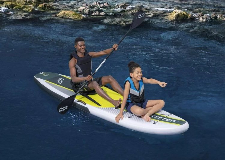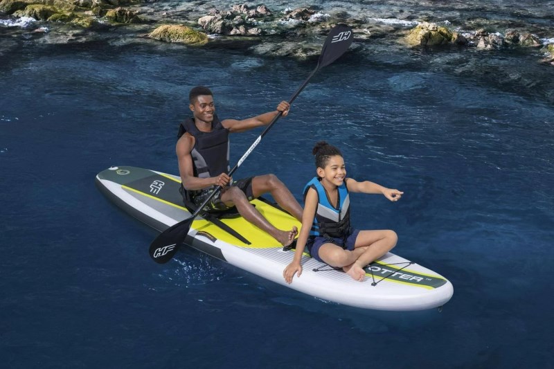 - Seat with backrest and footrest quickly turns this stand up paddleboard into a kayak for a relaxing ride