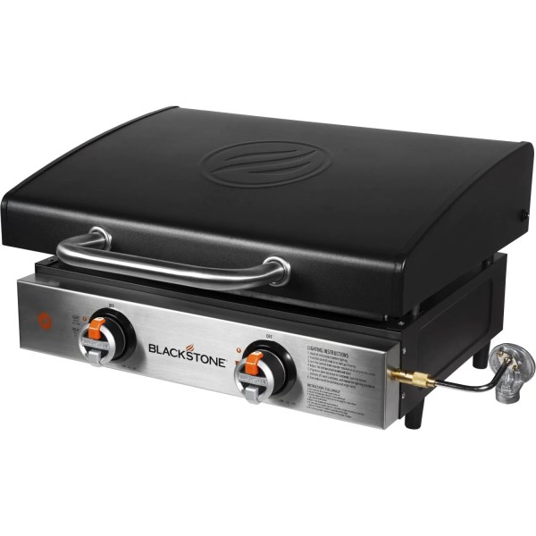 Bring the Blackstone cooking experience on your next trip with the 22-inch tabletop griddle. This portable griddle offers 362 square inches of all-purpose cooking space so you can cook for the whole party. Two powerful stainless steel H-burners deliver 24,000 BTUs of cooking power across the heavy duty surface, ensuring even and consistent heat for all kinds of meals. You can even create two distinct temperature zones for cooking a variety of foods at once. The steel griddle plate stands up to the toughest jobs and guarantees years of use out in the elements. Blackstone has implemented their own patented rear grease management system to provide no mess, hassle-free operation and easy cleanup. Upgraded, easy-to-use control knobs on the front stainless steel control panel let you easily control temperature and get you grilling fast with simple piezo ignition. Protect your griddle from dirt, damage, and the weather with the included hood. This hood secures to the rear of the griddle and lifts out of the way easily when cooking. The griddle comes ready for use with 1 lb propane canisters, but can be upgraded to use 20 lb tanks with an optional adapter hose & regulator (sold separately). This portable, propane-powered griddle will make you the hero of your next camping trip or tailgate.