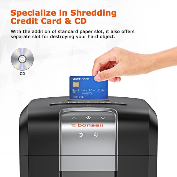 Shreds credit cards, CD/DVDs, clips, and staples as well, one at a time