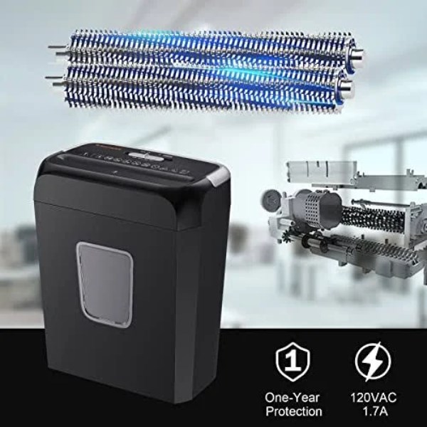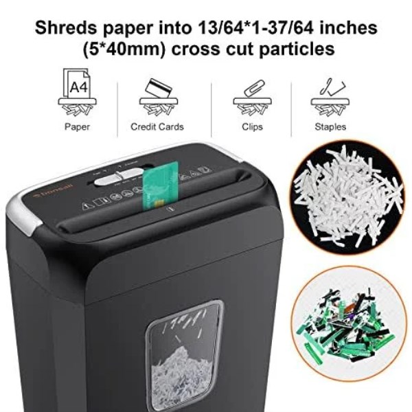 Bonsaii 6-Sheet Paper Shredder, 60-Minute Heavy-Duty Cross-Cut Credit Card Slotnn–u25B8Easy Operation for Home Use u25C2-Auto start and manual reversal to clear paper jams make it easy to operate.. The home shredder will shred continuously for up to 4 minutes before requiring a 40 minute cool down period. Continuous shredding of up to 145 sheets at a time 6 sheets at a time.nn–u25B8Cross Cut & Credit Card Paper Shredderu25C2- The cross cut shredders with 6 sheets shredding capacityuFF08no need to remove staplesuFF09, shreds paper into tiny particles measuring 5x45mm, high-security level P-3, destroys credit cards one at a time,also can shred staples, paper clips to keep your information safe.nn–u25B8 Overload & Overheat Protectionu25C2- Overloading protection prevents serious paper jams and thermal protection system with auto shut-off,it can prolong the lifetime of the motor and the shredders.nn–u25B8Easy to Clean & Placeu25C2-Bonsaii shredder feaS