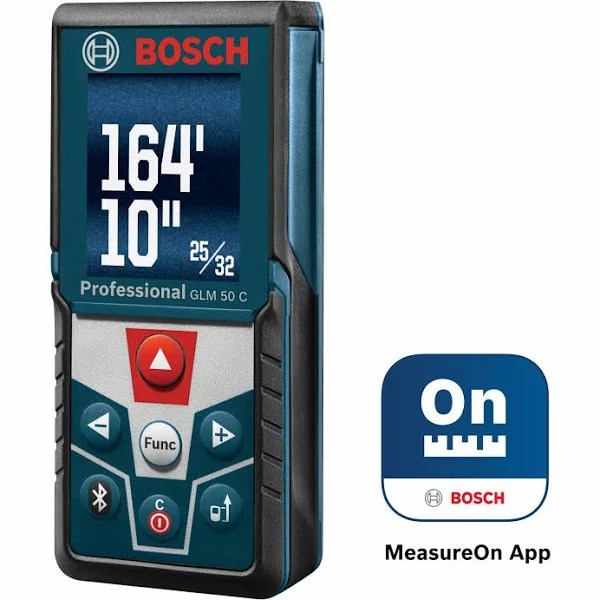 Bosch GLM 50 C Laser Measure – Precision and Accuracy on the Job Accurately calculate area, volumes and triangulate for surveying purposes using this Bosch 165′ laser measure. Beyond distance, this compact and pocket-size implement gives you double indirect, angles and stake-out values with an integrated inclinometer. All the measurements are made available in an easy-to-read format on a color display with back lighting for better visibility in low-light areas. Bluetooth-compatible and compactly designed, this pocket-size laser measure can be paired with apps so you can use the readings in a larger format.
