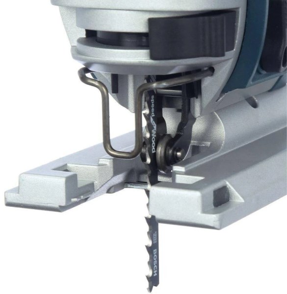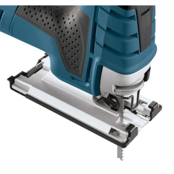 Get power and ease of use with the Bosch 7.0 Amp Barrel-Grip Jigsaw (JS470EB). Its toolless blade-change system offers fast insertion, and it has a blade ejection lever that eliminates the need to touch the hot blade. The ambidextrous lock-on button enables you to make steady long cuts, plus it has a large, sturdy die-cast foot with steel insert and an on-board bevel wrench. Its multi-directional blade clamp provides superior grip of T-shank blades while the adjustable dust blower keeps the cutting line clear. The precision-machined plunging system and low-vibration design gives you enhanced accuracy and smooth operation. It has 4 orbital-action settings, with different blade strokes for smooth and aggressive cuts. Plus, it has an ergonomic top handle with soft-grip areas for solid, comfortable grip.