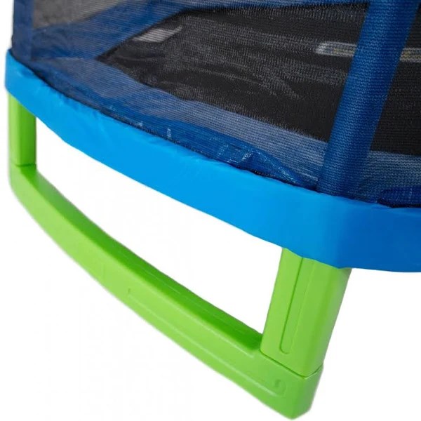 Keep little ones entertained and active in the backyard with the Bounce Pro My First Trampoline in blue and green. Designed with fun, quality and safety in mind, it features a three-arch netted safety enclosure that keeps children contained as they play while providing parents with unrestricted visibility. This kid’s trampoline also includes a padded spring cover and a UV-resistant jump mat sewn together to prevent any unwanted contact with the springs. Blow-molded plastic U-legs maintain balance and stability while foam padding on the frame poles provides an additional layer of safety. The galvanized steel frame stands up to the elements and resists rust. Kids can enter and exit easily through the zippered opening. The Bounce Pro 7′ My First trampoline is easy to assemble, offering convenience and saving time.