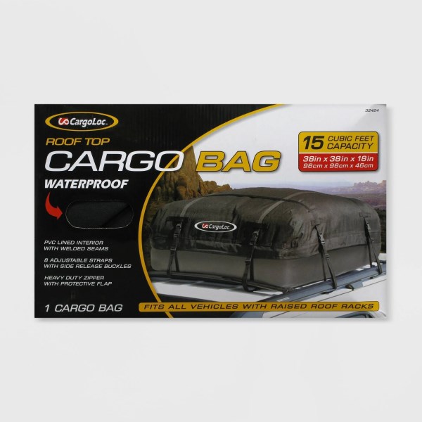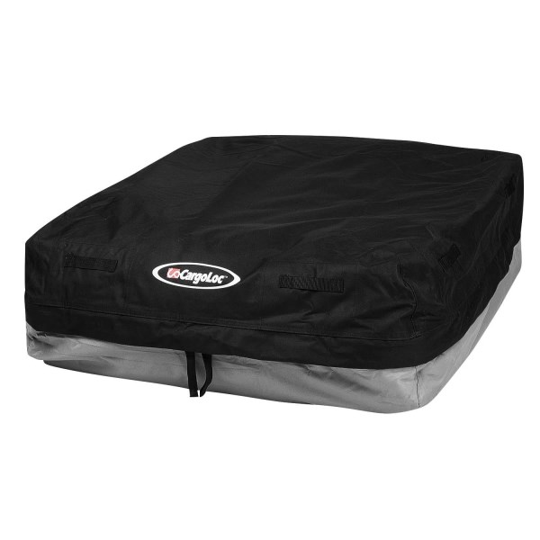 PVC lined interior with welded seams 8 adjustable straps with side release buckles Heavy duty zipper with protective flap Size : Waterproof, Black This Allied International 32424 cargoloc rooftop cargo carrier is 15 cubic feet and weather resistant. Dimensions: 38 inches by 38 inches by 18 inches.The Deluxe is bigger. 15Cubic feet vs 10. Includes 8 straps vs 4.