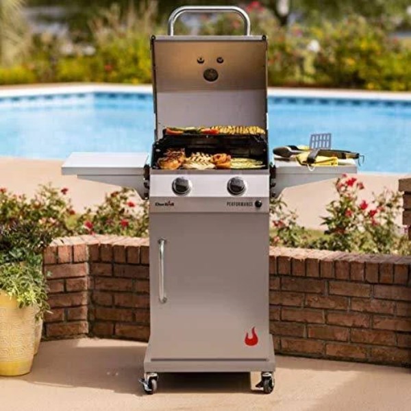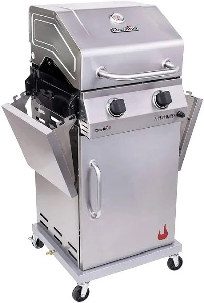 The Char-Broil Performance Series 2-Burner Gas Grill comes in a space-saving size with everything you need to get the good timed going. With 310 square-inches of primary cooking space, you can grill burgers for 24 or dinner for two. Features a lid-mounted tempertature gauge and convenient side shelves which fold down for storage, along with an exclusive stainless steel finish and a top-ported stainless steel burners for lasting performance. Its easy to assemble and equipped with electronic ignition to ensure reliable burner lighting and a sleek compact design for classic good looks