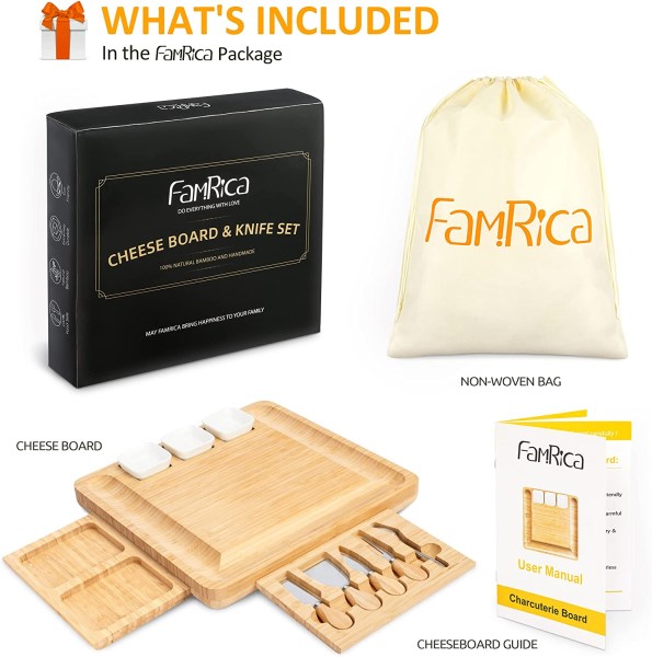 ?Warm water and mild soap should be used to hand-wash the charcuterie board set. If your charcuterie tray gets water on it after washing, wipe it off with a dry cloth. If you own a wet bamboo product, please do not let it sit directly in the sunshine. Instead, place the dry cheese board and knife set in the bag to prevent dust from falling inside.