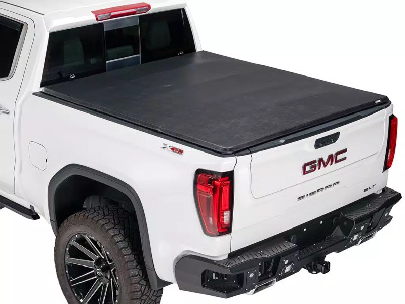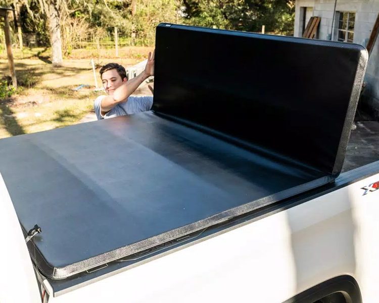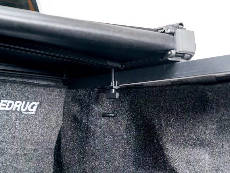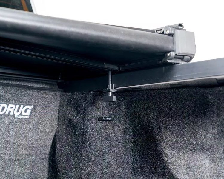 The Gator Recoil is a low profile retractable tonneau cover that is constructed of rigid aluminum panels and comes in a UV-resistant matte black finish. This cover utilizes a sealed ball bearing roller design that allows the cover to open and close without the use of a spring or any mechanisms that can possibly fail. To operate the cover, drop the tailgate and pull the grip latch on either side of the bed. Pulling the grip latch releases the cover from the first latch stop so you can push it to the second. The second latch stop is fully adjustable, as you can move the cover anywhere along the rail that you choose. For more bed access, pull the grip latch again and push the cover to the last latch stop. The cover is fully secured at any one of these latch stops and you can drive down the road with peace of mind. To close the cover, pull the grip latch again and pull the cover all the way to the tailgate. Paired with a locked tailgate, the cover cannot be opened, providing an added level of security for your cargo. While no tonneau cover is 100% waterproof, the Gator Recoil does a great job of keeping water out of the bed of your truck. Any water captured on top is going to funnel down your rails, into the canister, and out of the truck bed with provided drain tubes. Installation is fairly easy with no drilling and can be completed in about an hour.