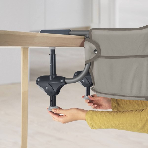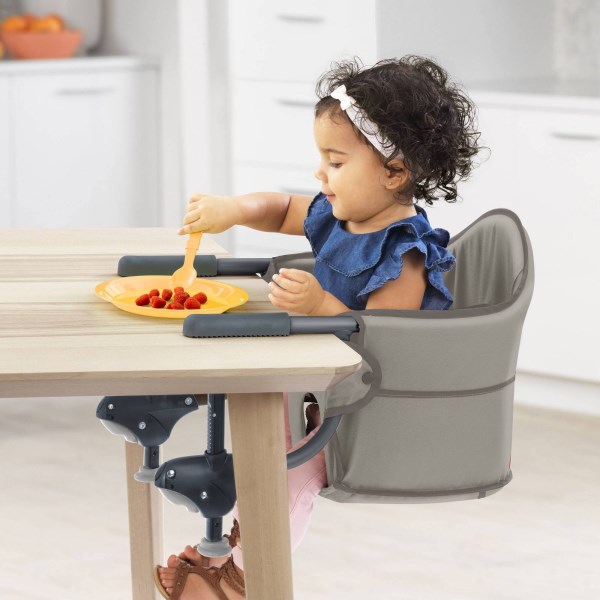 The Caddy Portable Hook-On Chair simplifies mealtime at home or on the go with secure attachment to dining tables, a lightweight frame, and a trunk-friendly fold. High-back cushioned support and a three-point harness help create a comfortable, secure seating area. An easy, twist-to-tighten design facilitates speedy, secure attachment to tables from 0.75 to 1.5 inches thick and with a skirt up to 5.5 inches. Soft-grip arms firmly clamp onto the table top without scratching, and the fabric seat cover can be removed and washed for easy-clean convenience. Twist-to-tighten design fastens securely to most tables Soft-grip arms firmly clamp onto a table without scratching Compact fold for travel and storage convenience Removable seat cover for easy cleaning and care High-back cushioned support for added comfort 3-point harness for security Lightweight metal frame Usage The Caddy is designed for children up to 37 pounds. Use only on tables 0.75 to 1.5 inches thick. Do not use on glass table tops, loose table tops, table leaves, card tables, single pedestal tables, or with tablecloths or placemats. Care & Maintenance Hand wash the seat cover in cold water. Drip dry. For complete care and maintenance instructions, refer to the label on the product and to the product’s instruction manual.
