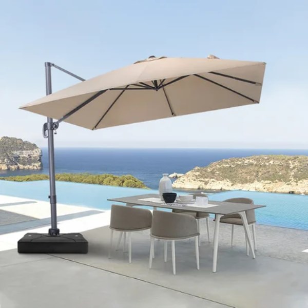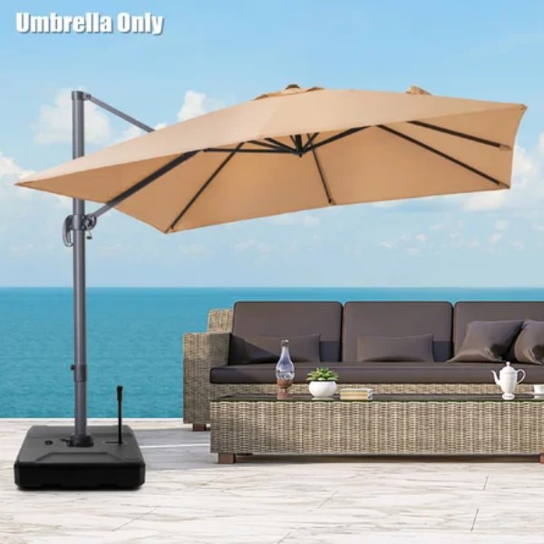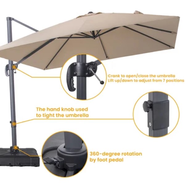 Using a large patio upgraded square offset umbrella is a fantastic way to help you enjoy your outdoor room. You can move the pole to any outdoor spot you like with the cantilever design, without worrying about it getting in the way of dining or entertaining. With 100% 240g solution-dyed polyester fabric, our patio umbrella provides feet of sun protection for vast areas. The UV protective and fade-resistant canopy are spread over 8 ribs with a single wind vent for 500 hours colorfastness in the sun that allows for wind and air to be safely “vented” through your umbrella. The lightweight durable Aluminum pole can resist the most of things from the environment throws at it, and the gray coating on the pole gives you a stylish touch feeling. It is easy to adjust the shade, and angle to ensure you are covered.