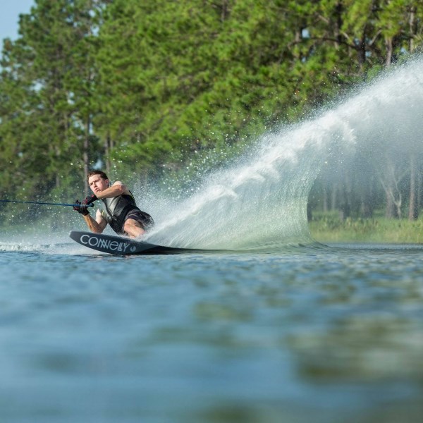 KEY FEATURES 550 square inches 35000 sq. cm. of surface area underneath provides massive lift for fun anyone can enjoy Standard Tunnel contour sets the ski deeper in the water to improve edge hold while increased flat surface area encourages stability Child size skis are for child-sized skiers and the Connelly Big Daddy Waterski is definitely for full-sized adults with its iconic Big Guy design. It’s got 550 square inches or surface area underneath delivering enough lift for riders over 220 lbs to get out on the water and have just as much fun as the kids are. Despite the size it delivers a surprisingly agile ride thanks to fiberglass construction that focuses on control while the Single Tunnel base ensures solid edge hold while carving. Also these waterskis come with an adjustable front boot and rear toe strap so you can easily dial in the ski and get on the water.