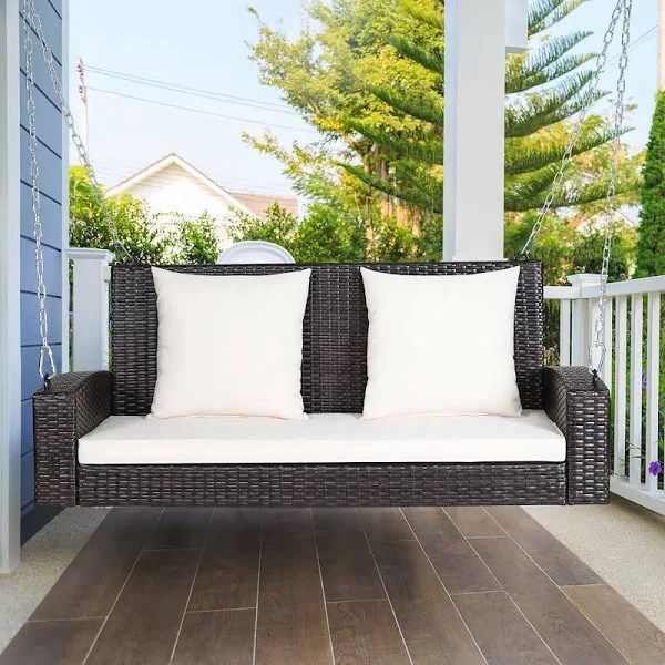 Costway 2-Person Patio Rattan Hanging Porch Swing Bench Chair Beige Cushion