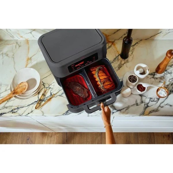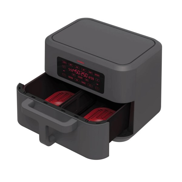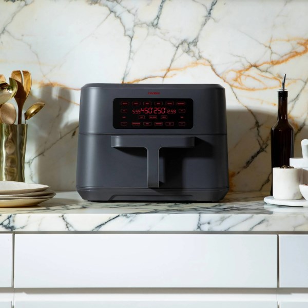 The only air fryer with patent-pending TriZone technology that lets you cook 2 foods at once at different times and temperatures, or remove the divider to use the full 9qt capacity for large family meals. The TriZone air fryer can intelligently synchronize 2 foods so they finish cooking at the same time. Choose from 6 different cooking settings, all while using little to no oil for foods with 75% less fat than traditional deep frying. CRUXGG helps support food insecurity programs. The Best Air Fryer of 2021 according to Esquire Equipped with patent-pending TriZone Technology to cook up to two different foods or one large meal High-performance circular heat technology Adjustable temperature range up to 450F Features 6 touch-activated cooking presets: air fry, broil, roast, bake, reheat, and dehydrate Air fry function allows for crispy food with 75% less fat (compared to deep-fried food) Comes with cook assist and reminder feature 12.4 Inches (H) x 16.25 Inches (W) x 13.66 Inches (D)