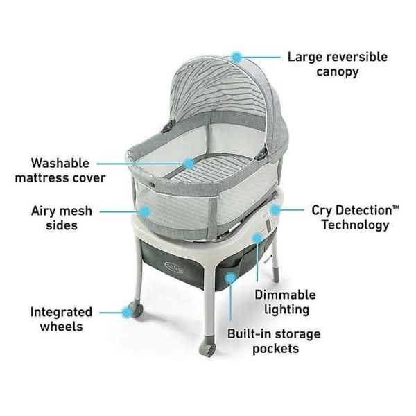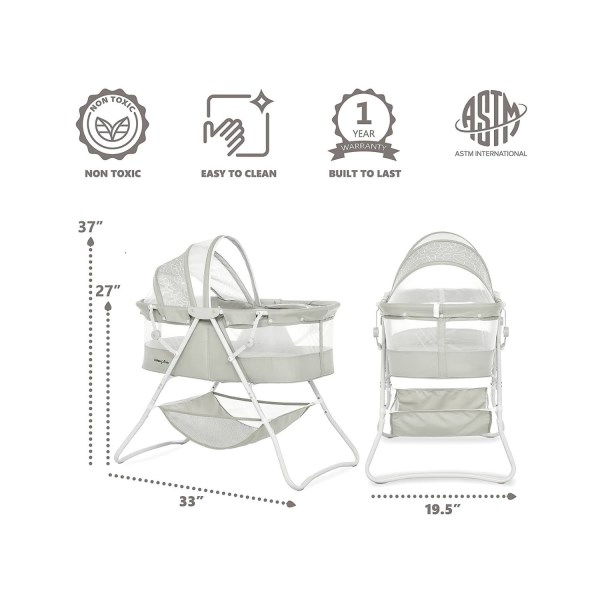 Delta Children Deluxe Soothing Dreams Bassinet is a modern close-to-the-bed sleeper that boasts tons of calming and convenient features. Designed to help your baby fall asleep faster and stay asleep longer, the hands-free vibration helps soothe your baby. The attached electronic pod features a soft nightlight, plays lullabies, and provides vibrations that you and your baby will love. Hanging plush stars on the adjustable canopy will engage and delight your baby while the sides are lined with breathable mesh all-around to help promote airflow, keeping your newborn comfortable throughout the night. Designed to look great in any space, this bassinet features a modern skirt over the mesh sides that is printed with a grey, gender-neutral diamond pattern. Other stand-out features include: an extra-large storage basket, a comfortable 1-inch waterproof mattress pad with machine washable fitted sheet, and wheels that make it easy to move around the house. This bassinet is recommended for babies 0-5 months. Max weight 30 lbs. Stop use at 5 months or once your infant begins to push up on their hands and knees, whichever comes first. Delta Children was founded around the idea of making safe, high-quality children’s furniture affordable for all families. They know there’s nothing more important than safety when it comes to your child’s space. That’s why all Delta Children products are built with long-lasting materials to ensure they stand up to years of use. Plus, they are rigorously tested to meet or exceed all industry safety standards