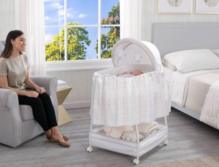 The gentle motion of the Soothe and Glide Bassinet from Delta Children creates a safe and comforting place for your baby to fall asleep. Allowing you to keep a watchful eye on your little one both day and night, this bassinet features wheels that make it easy to move around the house. Designed to create a calming environment, its gliding base rocks back and forth with a gentle push while the attached electronic music module plays calming lullabies and emits a soft light and vibration. The canopy features two plush toys that will entrain your baby when they wake up. The Delta Children Soothe and Glide Bassinet in Illusions includes a comfortable, 1 inch mattress pad, fitted sheet and is decorated with a contemporary geometric pattern in soft beige and tan. Delta Children was founded around the idea of making safe, high-quality children’s furniture affordable for all families. They know there’s nothing more important than safety when it comes your child’s sleep, play or activity space. That’s why all Delta Children products are rigorously tested to meet or exceed all safety standards.