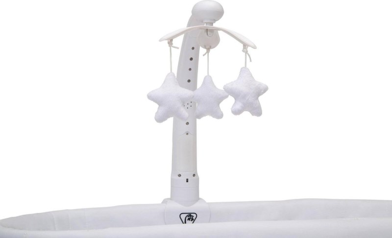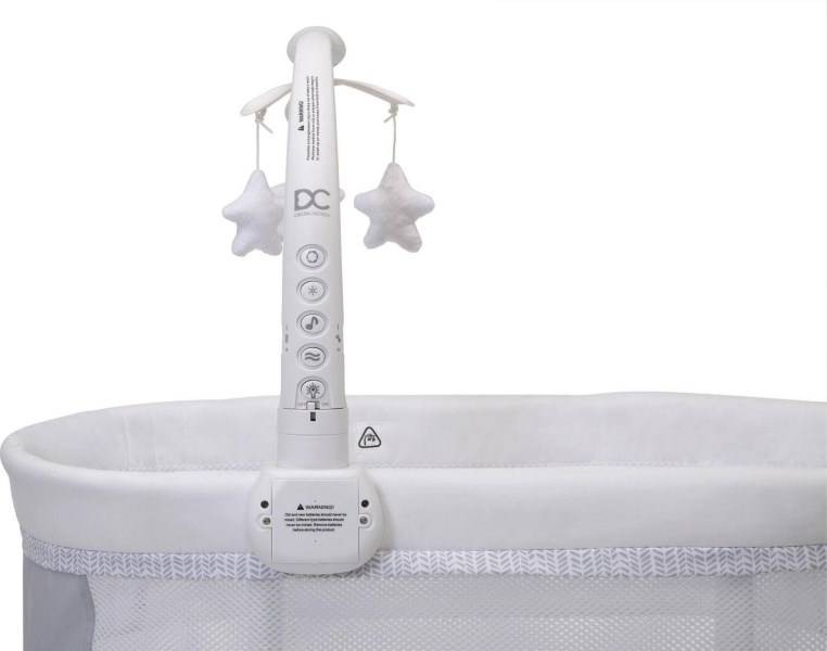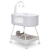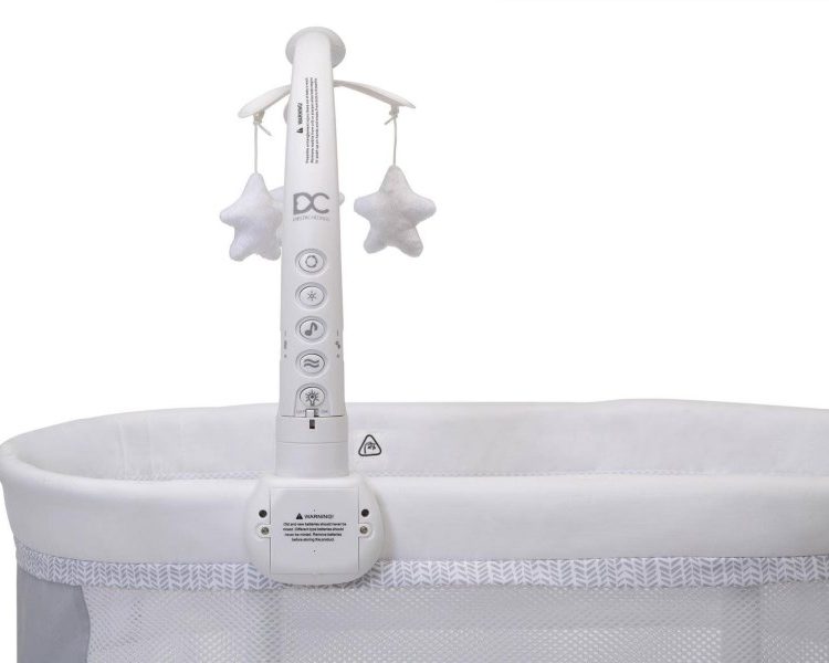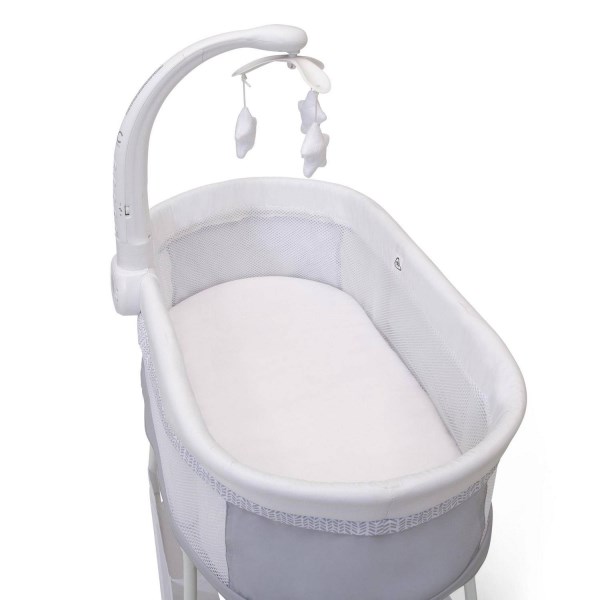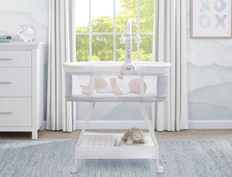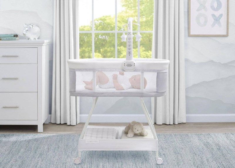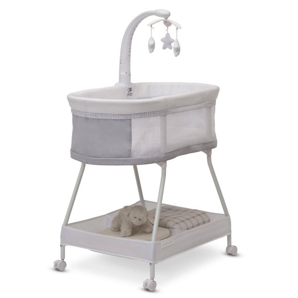 Help your baby sleep better with the Sweet Slumber Bassinet by Delta Children! The attached electronic mobile features spin toys, a soft-glow nightlight, soothing sounds, vibrations, and twinkle lights everything you and your newborn need. A breathable mesh window on the side increases airflow and provides a clear view of your sleeping baby. Use it anywhere in the house you need a cozy, safe sleep space for your little one, including your bedroom or living room, its wheels make it easy to move from room to room. A generously sized storage basket underneath the frame makes it easy to access all of your baby essentials, and the removable fitted sheet is machine washable for easy care. This bassinet is recommended for babies 0-5 months. Stop use at 5 months or once your infant begins to push up on their hands and knees, whichever comes first.