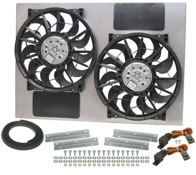 This high performance primary cooling fan kit combines two high output motors and a sturdy laser-cut powder coated metal shroud with pressure relief vents to produce one serious dual electric fan setup. Shroud measures 26″ wide by 18″ top to bottom and is only 4″ in overall depth to offer an adjustable yet precision fit. Designed for puller applications, It’s perfect for muscle cars, street rods and heavy duty trucks, this combination produces 4,000 CFM while each fan draws 24.8 amps. Includes mounting brackets, hardware and two high amp relay harnesses.