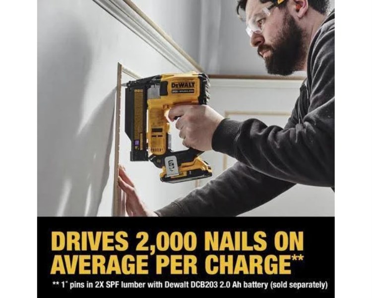 Complete finish, trim, and remodeling work with this DeWalt ATOMIC Compact Series 20V MAX Brushless Cordless Pin Nailer Kit (DCN623D1). The battery-powered nailer is designed to drive 23 Ga. pin nails measuring between 5/8 in. and 1-1/2 in. with its high-output brushless motor. Take advantage of cordless convenience as you seamlessly drive nails with no hoses, compressors, or gas cartridges required.