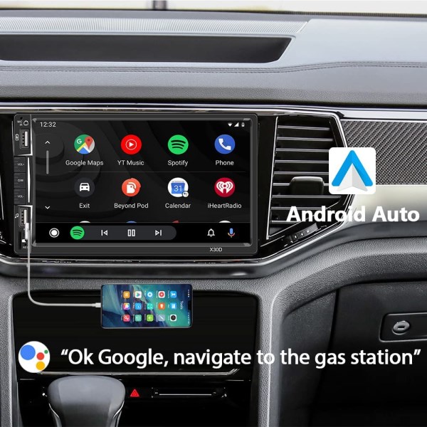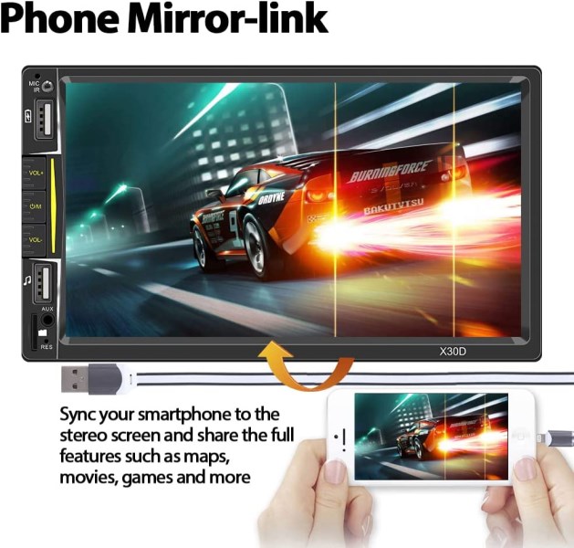 Compatible with Apple Carplay & Android Auto: Just connect with your smart phone that make it possible for you to access map navigation, phone contacts, email, notification. You are also able to wake up Siri or Google voice assistant to make operation even easier. Make you stay focused on the road and be safer from having to look down at your phone while driving. Phone Mirror-Link: Support “stereo-phone interconnection” for most cellphones. Through mirror-link, the car stereo will display the content from your cellphone screen synchronously such as maps, movies, games. Bluetooth 5.0 & Enhanced Listening Experience: The latest Bluetooth 5.0 technology brings a more stable Bluetooth signal and better music sound quality. Answer your important phone calls without distracting your attention from the road with Hyojum stereo( built-in clear mic). Reversing Image Function: Equipped with a unique 12 LEDs wick reversing camera, bringing you clearer night vision distance. The 7-inch touchscreen will automatically display the reverse image once you put the car into reverse gear. Make your daily reversing safer. Upgraded Capacitive Touch Screen: Compared with resistive screen on other stereos, Hyojum capacitive screen solution has higher sensitivity and accuracy which greatly enhances the human-computer interaction experience. You can now feel the silky smooth operation feel on the car screen! The professionally tuned HD LCD screen bringing you an excellent visual experience. Multiple Function Interface: Equipped with 2 USB ports, the lower USB interface can play songs / videos by U disk, and the upper USB can charge the phone at the same time. Support TF card, Aux in and car original steering wheel control function. Installation and Wiring: This stereo is universal double din standard with installation size 7.01 (L) x 2.56 (W) x 3.94 (H) inch. You only need to check whether the original installation slot of your car matches the same size. There will be no compatibility issues in use with the correct installation size. 1, Carplay for IOS: Carplay is a car-computer interaction system specially customized for IOS device by Apple. After connecting your iPhone to our stereo via the original USB-Lighting cable, you can operate Apps from your phone such as navigation, telephone, music, radio, etc. on the 7 inch stereo touch screen. The best advantage of Carplay is that your phone screen and the stereo screen work completely independently without being affected by each other. In other words, the two screens can display completely different content. The charm of Carplay is that once you experience it, you can never leave it again! 2, Android Auto: Android Auto is a car-computer interconnection system specially created by Google for Android phones. Connect your Android phone and X30D stereo through the original USB data cable, then you can operate various Apps customized for car stereo through the 7-inch touch screen. Similar to Carplay, your phone screen can still work independently. Android Auto directly turns your stereo into a smart large-screen touch device, and all applications are customized for car stereo, which is simple and convenient to control that makes your driving much safer. 3, Phone Mirror-Link: Unlike Carplay or Android Auto, the Mirror-Link function will directly project your phone screen to the car stereo. Any content on the phone will be synchronized in real time on the 7-inch stereo screen. In the Mirror-Link state, you can share movies, games, maps, etc. from your mobile phone to your family in the car through the stereo screen.