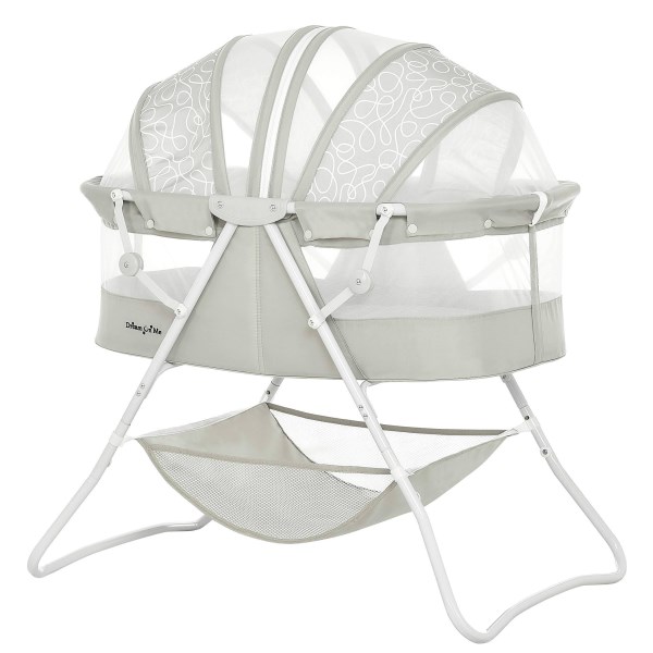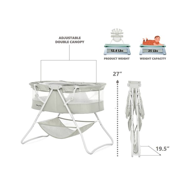 Pre-Owned — Lightweight, stylish and spacious- the Karley bassinet is every new parents’ Dream come true! One of its standout features is its portability. Weighing 12.4 lbs, it comes with a no-tool assembly & a lightweight aluminum frame, which allows you to move it from room to room. Thanks to a quick-folding mechanism, you can carry it outdoors without any hassle and use it There as well! You’ll never be short of space with the Karley bassinet. It is spacious and airy and comes with an adjustable double canopy that keeps nasty bugs and curious Pets at bay. Your baby’s essentials are never far away thanks to the attached large storage bag. It comes in nine beautiful finishes to blend in with any nursery theme. It is made of easy-to-clean soft and safe polyester foam fabric. It comes with a dual-sided 1-inch thick mattress pad as recommended by the ASTM/CPSC. Mattress pad dimensions are 30Lx15Wx1H inches. Bassinet dimensions are 33Lx19. 5Wx37H. The height with the canopy is 37 inches, Height without is 27. Recommended for newborns up to 25 lbs. It meets flame retardant requirements of CPSC, CA prop 65, Vermont act 0085 (bill S.81), NY law 37-0701/9.
