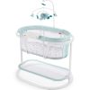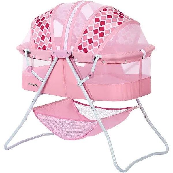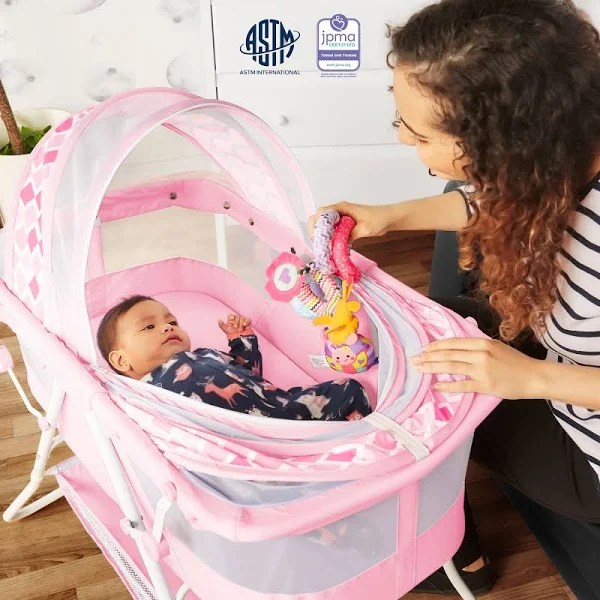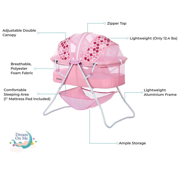 - The Karley Bassinet is the perfect solution to keep your baby next to you. After giving birth, it is also easier to lift the baby in and out. One of its exceptional characteristics is its maneuverability. It comes with a lightweight aluminum frame, which allows you to move it from room to room. Travel outdoors with ease thanks to its simple folding mechanism. Your baby’s necessities will never be out of the way thanks to the attached large storage bag. It is made of easy-to-clean soft and safe polyester foam fabric. Specifications Can be used indoors and outdoors Made of a polyester foam fabric Features a double canopy and sleeping pad Lightweight and versatile Quick folding mechanism Recommended for newborns up to 25 lbs. Includes 1′′ thickness mattress pad as mandated or recommended by ASTM/CPSC JPMA certified to meet or exceed all safety standards set by the CPSC and ASTM. Dimensions & Weight 33′′ L x 19.5′′ W x 37′′ H 12.4 lbs.