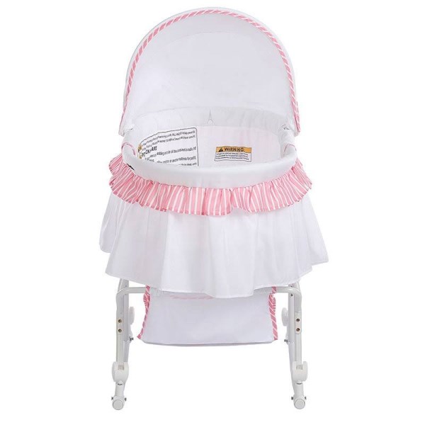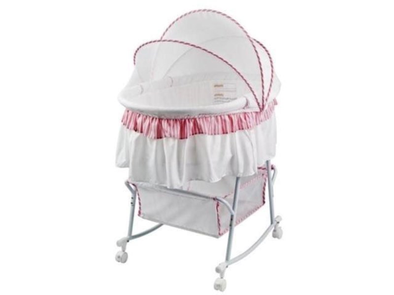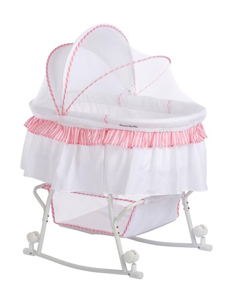 Graceful and functional, the Lacy Portable 2 in 1 Bassinet is an indispensable asset for the early months of parenthood. Spacious and roomy, it also doubles up as a soothing rocking cradle – simply rotates its wheels upwards to convert it. What could be better than having a bassinet and cradle, all in one? Lacy has a lightweight aluminum frame and comes with hooded locking caster wheels. Light and portable, it allows you to always have your baby nearby. The bassinet is made of a comfortable and safe polyester foam fabric. It boasts a dreamy design aesthetic thanks to ruffles and frills. Choose from single/two-tone and patterned finishes that blend easily with any nursery theme. Keep all baby essentials handy in the large storage basket below the bassinet. The Lacy features a multipurpose full canopy that is part mesh part fabric and helps keep bugs and insects at bay. The Lacy Bassinet is JPMA certified to meet/exceed ASTM standards. It includes the regulatory 1 thick inch mattress pad. Use from birth until 25 lbs until baby can push-up/roll over unassisted.