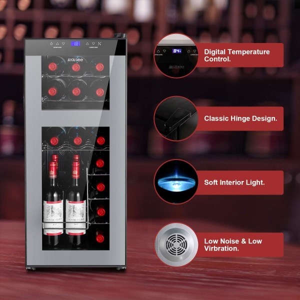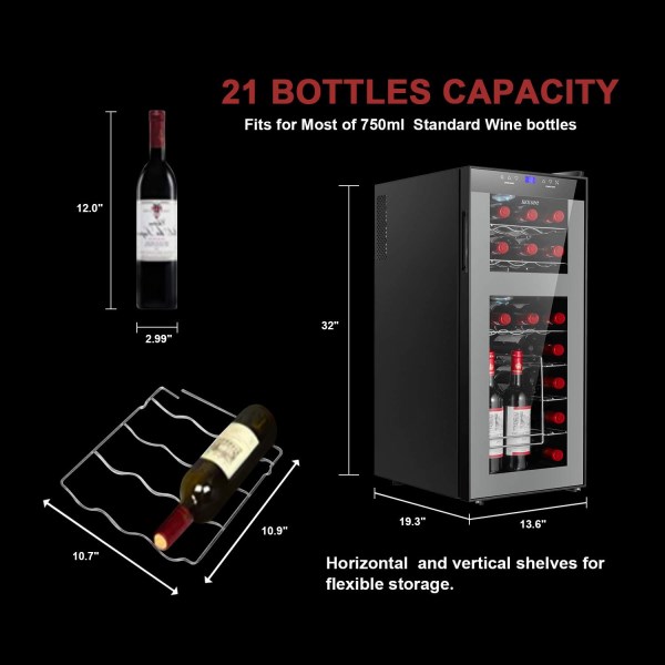 KEEP DIFFERENT KINDS OF WINE IN BEST STORAGE TEMPERATURE: Maisee dual zone wine cooler is designed with a moderate and adjustable temperature range 44-65°F(7-18°C) within a consistent humidity, The temperature of the upper zone is 44-54°F(7-12°C), where you can store Sparkling/champagne, Semi-Sweet Wine, Semi-dry Wine, Dry White Wine etc. the lower is 54-65°F(12-18°C), where you can store Sweet Wine, Brandy, Semi-dry Red Wine , Dry Red Wine etc VERTICAL AND HORZIONAL RACKS AVAILABLE FOR FLEXIBLE STORAGE: The small wine chiller features the upright rack for an opened and recorked bottle.Besides, these racks are removable to customize the storage space for larger bottles. The Dimension of the wine chiller are 13.6”(W)x19.3”(D)x32.1”(H) gives you a compact and modern design perfect for your living room, home office, or kitchen. It has a freestanding design for floor, table or countertop placement. QUIET AND LOW VIBRATION: The wine cellar use thermoelectric cooling technology which is quiet and without vibration. So it does not affect family rest even if placed in the bedroom Maisee wine cooler is ETL certified, meaning it would use 25% less energy than the more conventional wine coolers. UV-RESISTANT DOUBLE-PANED THERMOPANE GLASS: 18 bottles capacity wine chiller have double-paned glass can not only keep your collection away from the outer environment but also help avoiding the harmful light which will damage the tannin and overall flavor of your wine.Besides , the interior light won’t give off wine-destorying UV that the sun does either. QUALITY ASSURANCE: All of maisee wine coolers produced by certified materials and conforms to CL certified. This allows the wine to age properly and provides a full flavor and soothing aroma . – FEATURE /b br * 21 Bottles mini small wine cooler br * Dual Zone Wine Cooler br * Thermometric Technology : Low vibration & Low Noise br * Vertical and Horizonal Racks Available br * Wine Cooler Temperature Range : 44-65°F(7-18°C) br * Dimensions : 19.3″(D) X 13.6”(W)x32.1”(H)