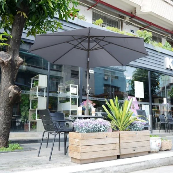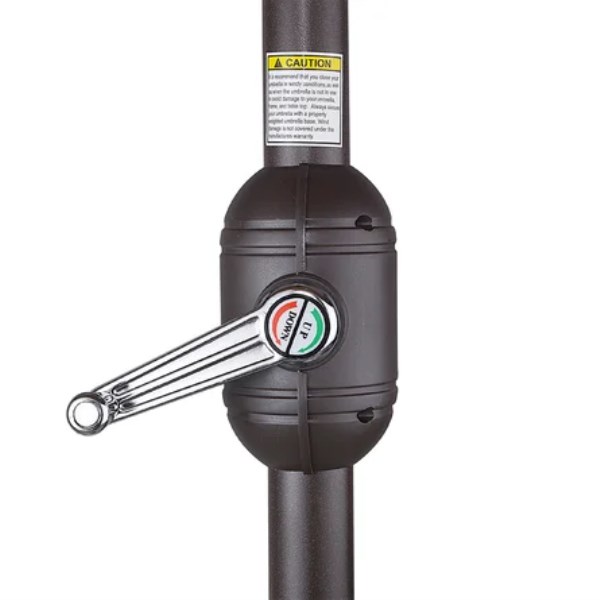 Create a cool and comfortable spot to entertain guests under an attractive piece of outdoor decor that also provides quality sun protection with this Evanoff 9′ Market Umbrella. The easy-to-use hand crank opens and closes the umbrella in seconds to block sunlight so you can relax in the shade during hot summer days. The convenient push button feature allows you to adjust the vertical tilt of the 9-foot canopy in 5 positions, providing UV protection where ever the sun is shining. In addition, this umbrella is constructed with 8 steel ribs and a durable aluminum pole for superior strength while enduring heat, wind, and rain. Simply crank the umbrella closed when not in use and use the built-in strap to secure it to the pole.