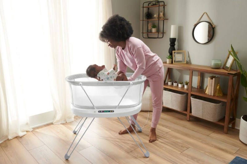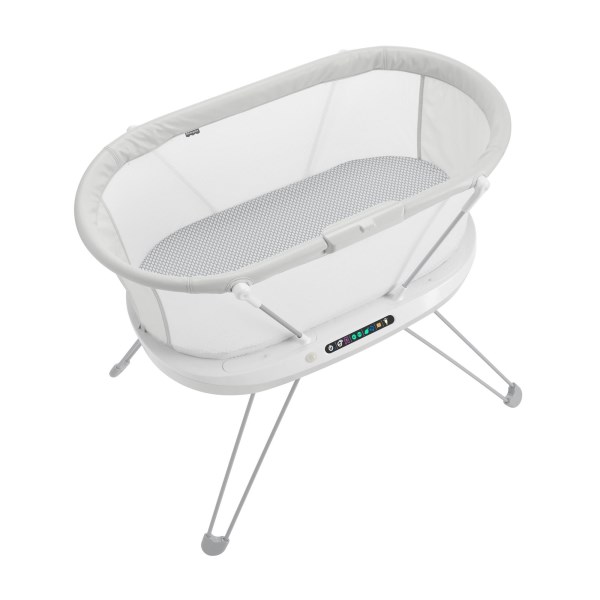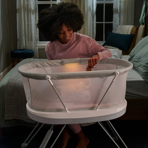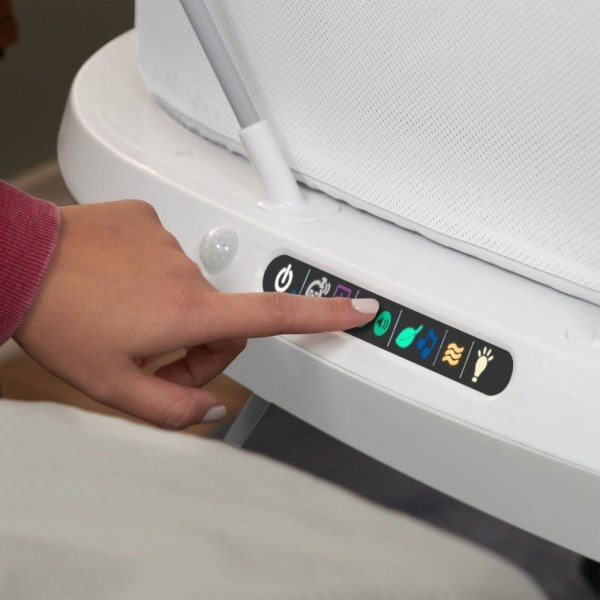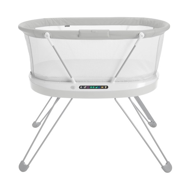 - Bedside bassinet with soothing nightlight, music, sounds and vibrations you can control from your smart device