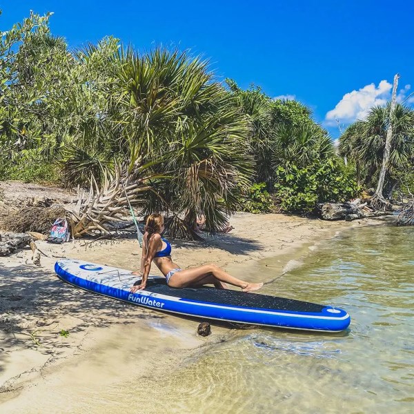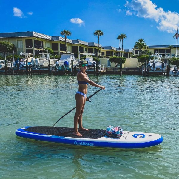 Specification:BrandFunWaterColorBlueSize335 x 82 x 15 cmMaterialPVCWeightMax about 150KGAir PressureUp to 15PSIWeightAbout 12KGFeatures:1. Stability: the inflatable stand up paddling board is 335 x 82 x 15 cm in size but very light only 7 kg. Of course, our sups also holds up to a maximum safety pressure of 12 psi. Maximum capacity is up to 350 lbs. Ideal for beginners and advanced users.2. Full accessories: paddle board for adults comes with everything you need: your board, bi-directional high pressure pump, safety leash, three fins, backpack, adjustable aluminium paddle, emergency repair kit. Waterproof mobile phone pocket. You can spend the whole day on the water paddle board.3. Versatile board: this stand-up paddle board is suitable for paddling, yoga, touring, fishing, surfing on the water. With the updated D-rings, secure lead, cargo area and premium accessories, our inflatable SUPS applies to any condition.4. Multifunctional inflatable SUPS: paddle board use for beginners and adva