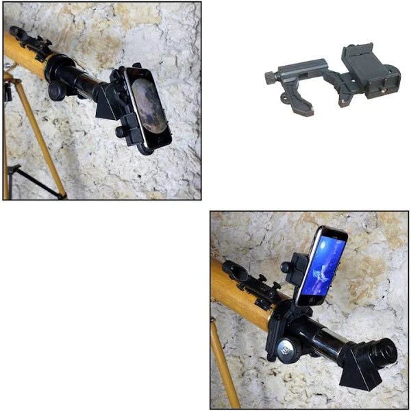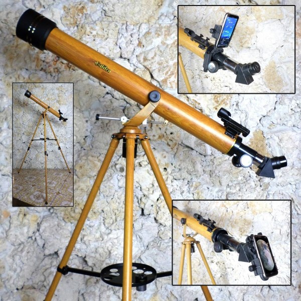 Bring the outdoors into your home with this handsome and unique natural Wood Grain finish Telescope from Galileo. The Wood Grain finish is on both the telescope tube as well as the tripod for a complete natural look of the outdoors. Perfect accessory for any Home and Office environment and a perfect Gift for the Sportsman/Nature enthusiast! The Galileo SS-G860WG Refractor Telescope and Galileo G-SPA Smartphone adapter kit lets you use the camera feature on your smartphone to take pictures or video through the optics of your telescope, or use your smartphone to assist navigating your telescope view to your celestial object of interest. Finding your target is easy with the Altitude Azimuth yoke mount. It’s simple to use up and down, left and right movement is great for beginners and casual star gazers alike. Terrestrial viewing is extremely easy due to the included 45° erect image prism which produces a totally erect image. The Mount features a slow motion altitude adjustment rod for precision adjustments and is attached to a very sturdy, fully adjustable, pre-assembled metal tripod with retractable rubber feet. The telescope’s optical tube assembly is finished out with a large 1?′′ format focuser. The Galileo SS-G860WG optical tube assembly features an 800mm focal length. The objective lens is a 60mm two element achromat (color correct crown & flint) air spaced objective lens. The tube itself is aluminum, painted flat black internally, and fully baffled for excellent visual and CCD imaging. The objective is fully multi-coated and has a resolving power of 1.61 arc seconds. The optical tube assembly is diffraction limited at λ4 (1/4 wave in Sodium light). The finderscope is Galileo’s Mars’ Eye electronic Finderscope which helps by getting the observer behind the telescope without losing the surrounding field of view when targeting objects. Included with the SS-G860WG are a 1?′′6mm, and 1?′′20mm eyepiece.