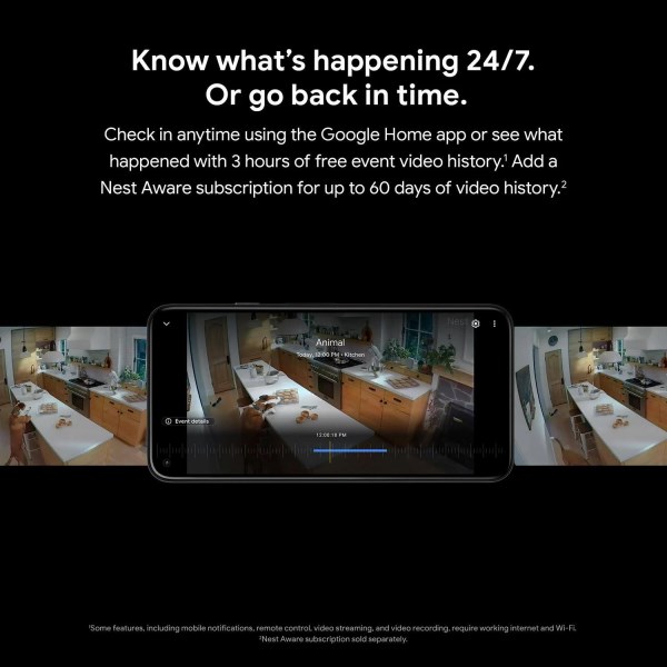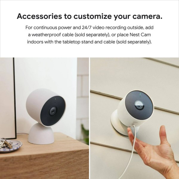 Whos in the garden? Are the kids doing their homework yet? The wire-free and battery-powered Nest Camera works anywhere you need it, from the living room to the backyard. It knows the difference between people, animals, and vehicles, so you can get the alerts that are important to you. If something happens, you can respond to alerts right from the Google Home app and listen or speak through the camera from the Google Home app too. Check in anytime with 24/7 live view. If you miss a notification, you can always go back and see what happened with 3 hours of free event video history. And its easy to install yourself no outlet or wires required. If your Wi-Fi goes down or theres a power outage, Nest Cameras will automatically store up to one hour of recorded events in its local memory. Convenient accessories including are indoor stand or weatherproof cable are sold separately.