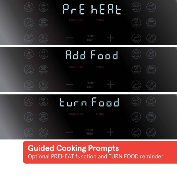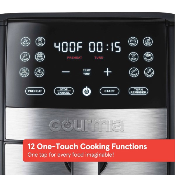Your goals for healthy eating do not have to be tabled when you crave your favorite fried foods. Gourmia 8 QT Digital Air Fryer with Guided Cooking, Black/Stainless Steel is powered by FryForce 360 degree Technology, so you and your loved ones can enjoy great food that is fried with air, not oil – eliminating up to 80% of fat! The air fryer boasts 12 One-Touch Cooking Functions, including Air Fry, Bake, and Dehydrate, making it oh so easy to prepare your meals without fuss. The angled touchscreen makes it easy to set and monitor and large display allows you to view temperature and time simultaneously. Guided Cooking Prompts give you the option to preheat the air fryer and enable a Turn Food reminder for cooking convenience and perfect crispiness every time. This stainless steel accents make this air fryer aesthetically pleasing, complementing any kitchen. Cleanup is easy with the nonstick basket and crisper tray that go right into the dishwasher.