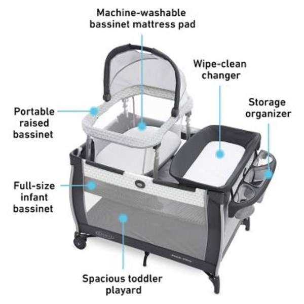 Graco Pack ‘n Play Day2Dream Travel Playard Bassinet In Rainier – The Graco Pack ‘n Play Day2Dream Travel Bassinet Playard features a raised bassinet that converts to self-standing, for use at home or travel. The lift-out infant bassinet has 2 height positions; the diaper changer features wipe-clean fabrics.