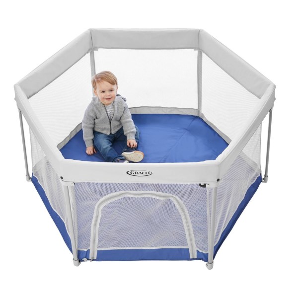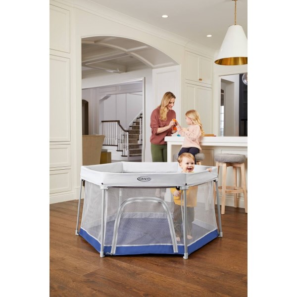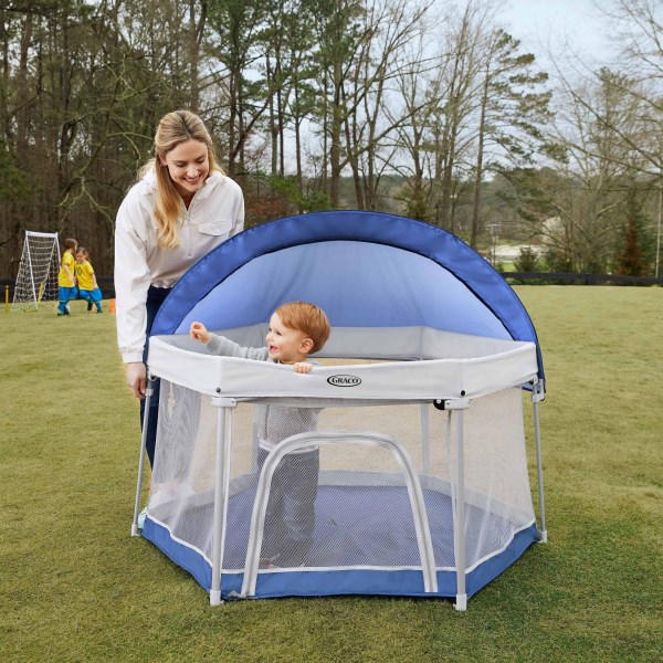For indoor or outdoor use, the Graco Pack ‘n Play Lite Traveler LX Playard folds up compactly for easy travel and storage. The LiteTraveler is the most compact folding outdoor playard* (*vs. the leading competitor), featuring a one-step setup and fold for easy use. This extra-large playard can be used like a baby gate to create a spacious play area for your living room or a roomy and safe outdoor play space for your backyard or deck. A removable UV 50 canopy provides sun protection and shade for outdoor play. Airy mesh sides help keep your child in sight as they play, while a zippered activity door allows for easy in and out. A padded floor provides added comfort. It features durable, removable fabrics that are machine washable for easy cleaning. Includes a travel bag with shoulder strap for on-the-go convenience.