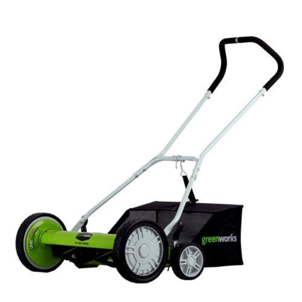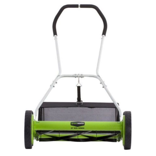 Greenworks 5-Blade Push Reel Lawn Mower with Grass Catcher. Large 10-inch front wheels and 6-inch rear wheels make it easier to maneuver across your lawn. Durable helical blades cut with ease. Nine position height adjustment offers a range of cutting heights from 1.75-inch up to 2.75-inch make for the perfect cut on all grass types. Perfect for yards up to 1/2 acre. Greenworks 40V tools are lightweight, start instantly, and require virtually no maintenance (no oil changes, no air filters, no gas cans, etc.); but still deliver gas-like power. With a collection of more than 40 lawn tools, one battery powers all the tools you need.