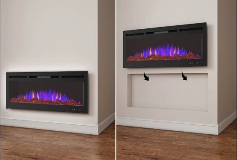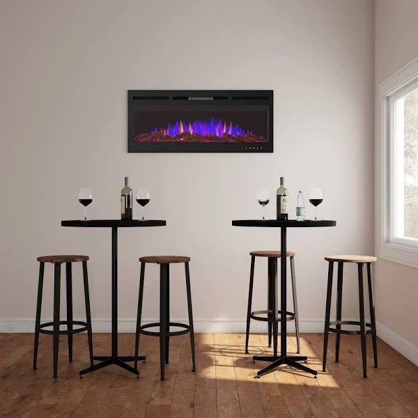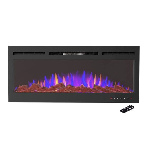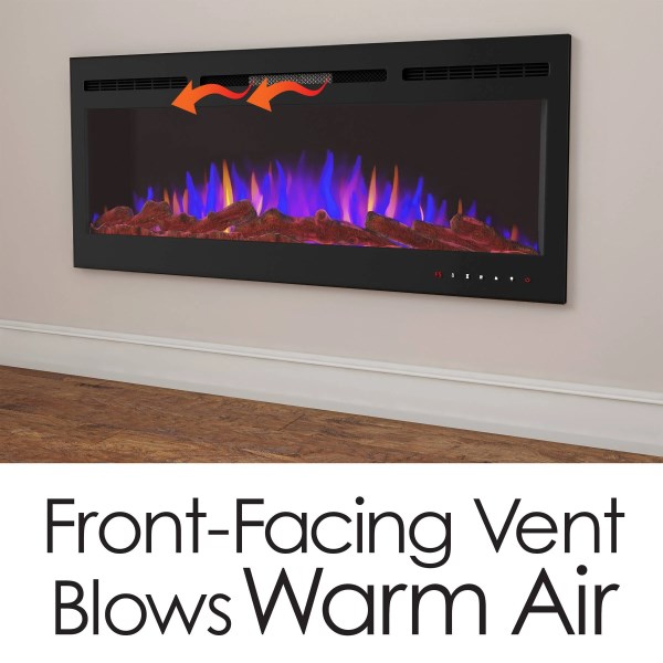 This 50 inch Electric Fireplace by Hastings Home can heat up to 400 square feet and enhance your home decor with its sleek style and ambiance created by the glow of the LED flame. This versatile fireplace is vented in the front and built to be hung or recessed into the wall, has adjustable heat settings, a built-in timer, 5 brightness levels, 3 media options, and 3 flame color options that can be controlled by a remote control or a convenient touch screen display. Operating at 750W on the low heat setting and at 1500W on high, this attractive electric fireplace has a heat or no heat option for year-round use without the hassle of cleaning or maintaining a chimney.