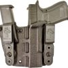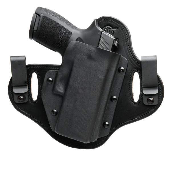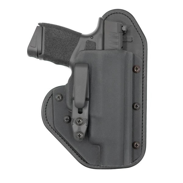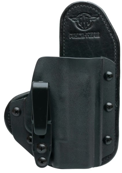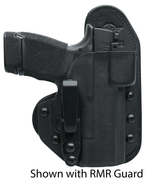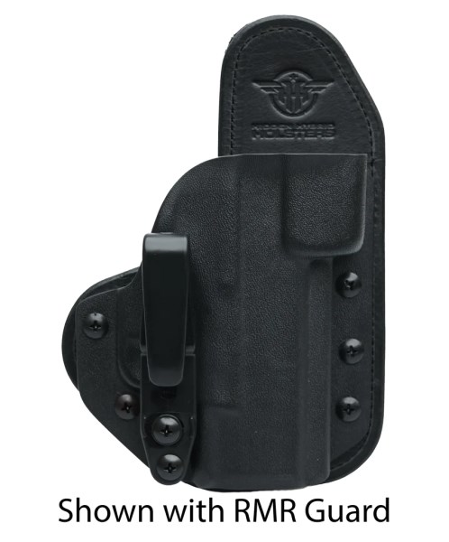 Springfield Hellcat and Hellcat OSP – Appendix and Strong Side Holster. Right Hand can be used anywhere from 1 to the 5 O’clock. Left Hand can be used anywhere from 7 to the 11 O’clock. Custom made, leather / molded Kydex holster. Each holster is carefully crafted to fit the gun specifications. Kydex is .093 thickness. Comfortable 9-10 oz. leather backing, with suede so your holster stays in place. Adjustable retention screws. Belt clips are adjustable to fit the height and cant of your liking. Excellent holster for concealed carry. Clips are mounted in a way that makes it possible to tuck a shirt in while wearing the holster.